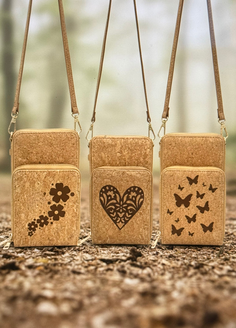 - Keep your essentials close with this beautifully crafted Cork Crossbody Phone Bag – designed for comfort, organization, and eco-friendly style. Made from soft, durable cork leather, this compact yet spacious bag offers three zippered compartments to keep your phone, cards, and small items secure and easy to reach.