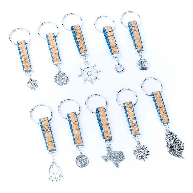 Handmade Denim & Cork Keychains - Random Selection - These beautiful keychains are handcrafted in Portugal using eco-friendly natural cork cord and denim fabric, accented with a variety of intricate silver-toned alloy charms.